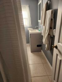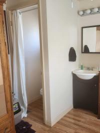 The guest room easily fits a queen bed and dresser. The half bath is a separate room within the guest room.