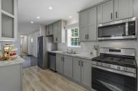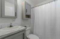 This home features extra large living room space and a galley kitchen. There are lots of cabinets but we love the tempered glass look on the upper cabinets adding style and a modern look!
