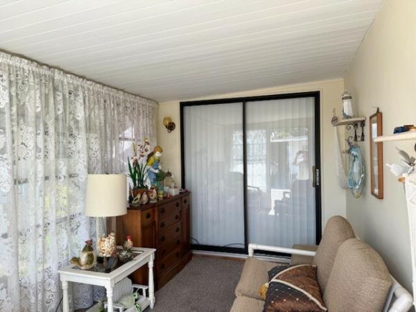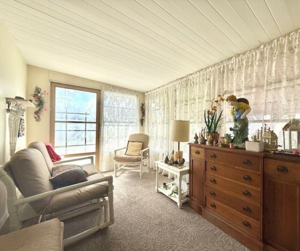 This home has very tasteful updates that include newer woodgrain laminate flooring throughout. The floorplan offers split bedrooms - the guest ensuite is located at the front of the home and includes a modest size bedroom large enough to accommodate a queen-sized bed as well as a large walk-in closet and 3-piece bath. The recently updated bathroom features new tile floors, a new vanity, stool, and walk in shower with tile surround. The large living area features an updated open kitchen with newer countertops & breakfast bar, a large dining area as well as a huge living room with windows galore! There is a large sunroom on the front of the home. The primary bedroom is toward the back of the home and features two standard sized closets & newer plank style laminate flooring. The main bath is adjacent to the bedroom. Outside, the home features a large, screened porch 11x20 with a shed toward the rear. There is also an air conditioned sunroom on the front of the home. The carport is oversized and large enough for 2 vehicles. The home features new double insulated windows throughout, a newer roof over w/transferrable warranty, & HVAC in 2020. The community is age restricted 55+ and all buyers are subject to community approval.
