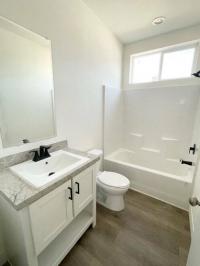 The hall bathroom features a beveled mirror above the porcelain rectangle sink that adds to the stylish design of this bath that includes a Silver Quartzite Formica? countertop, a matte black two-handled faucet. It also features a 60" fiberglass tub/shower combo with a matte black single-lever shower valve and head.