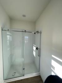 The primary bedroom offers a spacious walk-in closet and a luxurious en suite bathroom. The bathroom features a Silver Quartzite Formica? countertop with a square edge and a 4" backsplash, beveled glass mirrors are installed above each of the two porcelain rectangle sinks with matte black two-handled faucets. A 60" Galactic Ice Avonite? walk-in shower with glass barn doors is complemented by a matte black single-lever shower valve and head. The primary bath also includes a convenient linen closet.