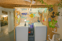 The property features 3-CAR PARKING, including 2-CAR COVERED CARPORT that flows into a 400-square-foot SCREENED ROOM with STORAGE SHED. With the right VISION and MODIFICATIONS, this space provides the POTENTIAL for ADDITIONAL BEDROOMS or FLEXIBLE LIVING AREAS. Inside, the KITCHEN is partially UPDATED with BRAND-NEW CABINETS (still in wrappers), NEW LAMINATE COUNTER-TOPS, a BARN SINK, and a TIKI-STYLE BAR TABLE that brings the BEACH VIBES home. An INDOOR WASHER & DRYER add to the convenience.