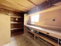 * 8'x12' workshop with electric, workbench, pegboard, shelving and a window.