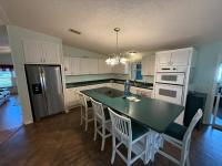 This well-cared for home is being sold as-is furnished. It is located on a perimeter lot on the exterior of the community. As you arrive at this home, you will notice the oversized driveway, nice walkway with simple landscaping, covered entryway and gutters around the home. As you enter the home, you are greeted by the beautiful laminate floors. The large primary living area has plenty of seating for relaxing and entertaining. There is a built-in wall unit with shelves and cabinets as well as a ceiling fan. The primary living area has lots of windows providing natural lighting. The large open kitchen has lots of cabinets and surface space. The double oven includes a microwave and convection oven. The large island has a glass top cooktop, pendent light, and high top stools at the breakfast bar. It has a stainless refrigerator. The dining area has a table with chairs, ceiling fan, and built-in wall unit with shelves and also has a wet bar. The indoor laundry room is off the dining room with tile floors and storage cabinets. The guest bathroom is located between the laundry room and guest bedroom. The bathroom has tile floors, a tub with shower, and linen cabinets. The guest bedroom has laminate floors, a large walk-in closet, and ceiling fan. The primary bedroom is large with laminate floors, a double wall length closet with mirror doors, and ceiling fan. The primary bathroom has lots of cabinets and surface space. It has a Bath Fitter walk-in shower. The enclosed room,(170 sq ft), has a wall A/C unit, laminate floors and ceiling fan. Off of this room is the concrete patio surrounded by brick pavers. The private yard is a good size for your enjoyment. This home comes with a golf cart. This home has ADA bedroom & bathroom doors.