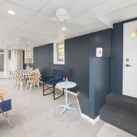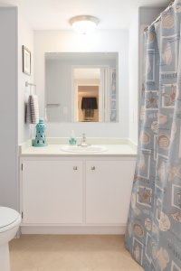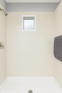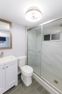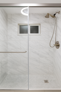 - Updated bath features include a two-door sliding glass entry leading to a rainfall showerhead in a custom ceramic-tile walk-in shower, complemented by a new vanity and toilet.