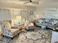 seats, updated vanity, double linen closet and durable tile floor. The large guest bedroom fits twin beds, has a double closet, wall-mounted TV, and ample space for furniture. The guest bath also is updated with a tub/shower, shelves and large vanity. Both baths are equipped with modern fixtures. The beautiful lanai off the living room