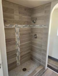 Both bathrooms showcase custom tile showers and stone-topped vanities