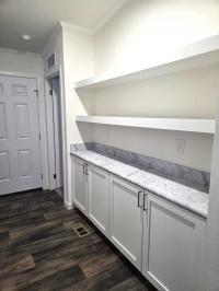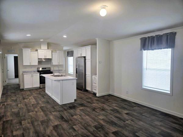 Step inside to find vaulted ceilings and a bright, open floor plan with white cabinetry, a spacious kitchen island, and a full stainless steel appliance package. The hidden laundry area and buffet-style storage nook keep everything tidy and functional.