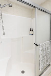 dual bench seating in the walk-in shower, modern vanity, and updated lighting