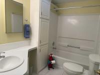 Bath off the hallway has a tub/shower with a tall cabinet for storage. The
