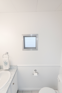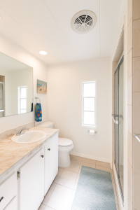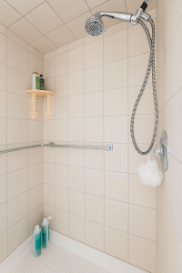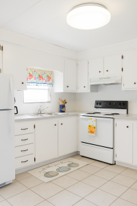The kitchen features bright white cabinets, laminate countertops, ceramic tile flooring, and comes fully equipped with a two-door refrigerator, microwave, and stove. The main bathroom has been updated to include a tile walk-in shower, offering a fresh, clean, and easy-access bathing experience.