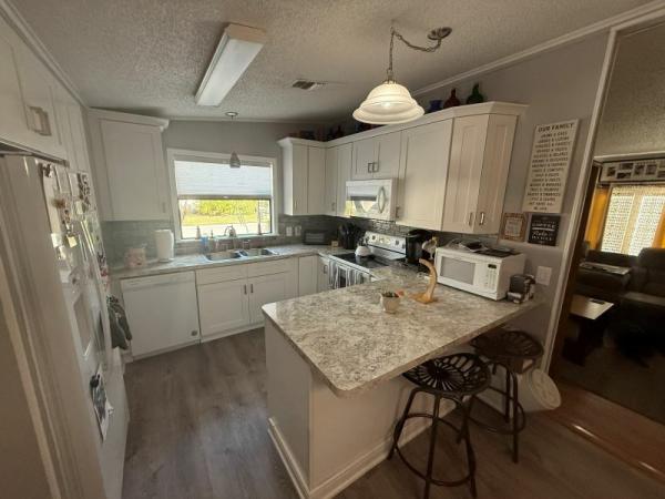 This well cared for 2-bedroom, 2-bathroom home is being sold partially furnished. As you arrive at the home, you see tasteful landscaping, gutters around the home and a front lanai. When you enter the home, you enter through the lanai. This room has indoor/outdoor carpeting and ceiling fan. When you enter the home through the sliding glass doors, you are in the primary living area. This room has reclining furniture and luxury vinyl plank floors. The kitchen has newer cabinets with soft close features, 2 lazy Susans, pullout drawers and a breakfast bar. The dining area has a pendant light. The guest bathroom has an updated single sink vanity with tub and shower. The primary bedroom has luxury vinyl floors, ceiling fan and large closet. The guest bedroom has luxury vinyl floors, ceiling fan and large closet.