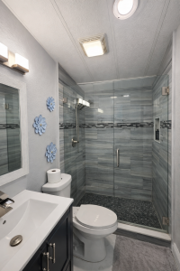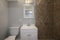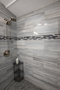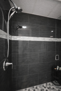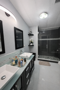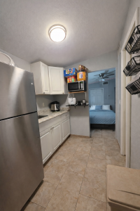 The mother-in-law suite is fully self-contained and beautifully appointed with ceramic tile flooring, a custom tiled walk-in shower, new vanity with overhead mirror, modern lighting, new toilet, finished drywall walls and ceilings, two ceiling fans, and a fully updated kitchen featuring new cabinets, countertops, a stainless-steel refrigerator, and microwave.