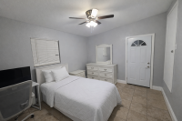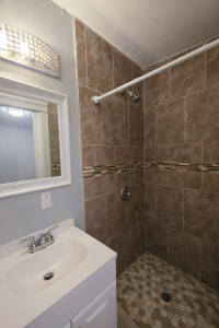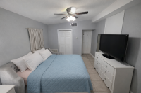 The additional bedrooms are generously sized, many suitable for king beds, and feature large walk-in closets with ample storage. The guest bathroom is equally impressive, offering a fully updated custom-tiled walk-in shower with rainfall showerhead, new vanity, new toilet, and modern fixtures.