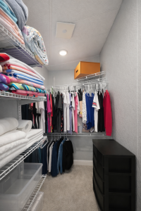 The primary owner's suite easily accommodates a king-size bedroom set and includes a ceiling fan, a stunning en-suite bath with dual-sink vanity, his-and-hers mirrors, modern white fixtures, a custom glass-enclosed tiled walk-in shower, and a massive L-shaped walk-in closet fit for royalty.