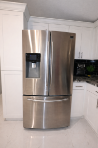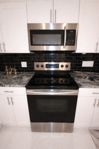 The chef's kitchen is a showstopper, featuring new white cabinetry, a striking black tile backsplash, gray marble-style granite countertops, a stainless steel glass-top stove with overhead microwave, and a three-door stainless steel refrigerator with ice and water dispenser-perfect for entertaining and everyday living alike.