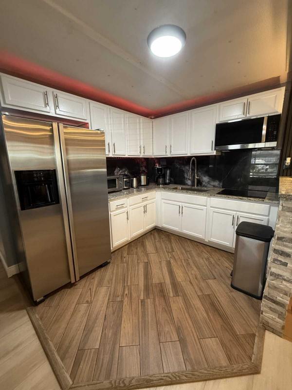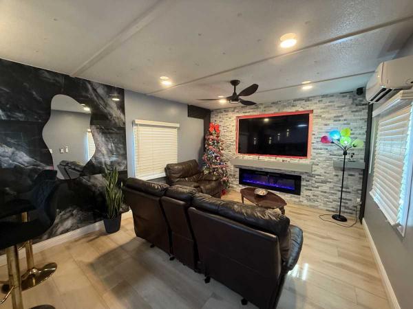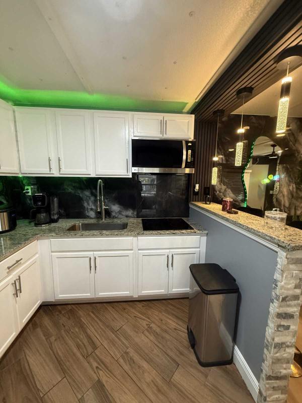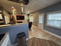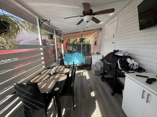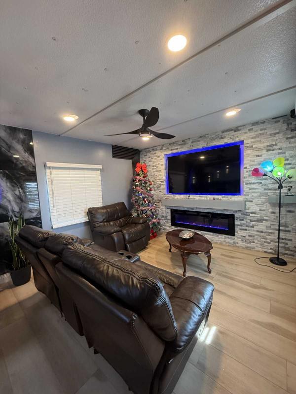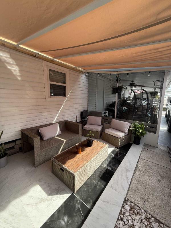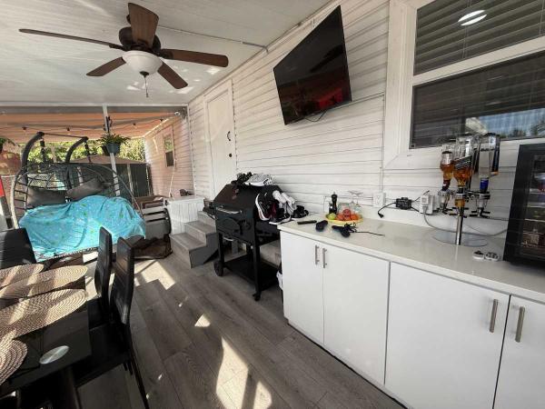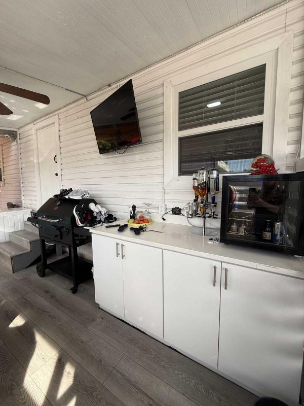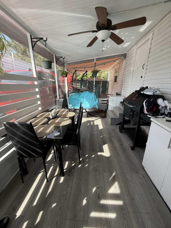 This beautifully updated home has been fully renovated from top to bottom, offering modern style, comfort, and functionality throughout. The renovation includes new sub-flooring and luxury vinyl plank flooring throughout, including the screened-in patio, with new baseboards, new paint inside and outside. The kitchen features new cabinetry, stainless appliances, granite countertops, marble backsplash, tile flooring, glass-top stove, new sink and faucet and color changing lighting. Three modern pendant lights hang above the eat-in area and thoughtful finishes between kitchen and main living area. The family room showcases custom stone accent walls, a built-in fireplace, and a 75" flat-screen TV that conveys. The bathroom has been completely redone with new cabinets, granite counters, new shower, upgraded fixtures, stone wall accents, and modern lighting, creating a spa-like feel. The large bedroom includes three closets, luxury vinyl flooring, and a 55" flat-screen TV included. New baseboards, updated lighting throughout, and designer finishes complete this truly move-in-ready property. Additional living space is found in the upgraded screened-in porch, with wood slatted privacy walls, featuring built-in cabinets, luxury vinyl flooring, a ceiling fan, a 45" TV, and a washer/dryer combo. Outside, enjoy an additional private patio area currently styled with seating for outdoor relaxation, plus a storage shed conveniently located just beyond. Major system upgrades include new windows (2025) throughout for excellent noise reduction, with new blinds with a valance on each window, a ductless mini-split system, new water heater, and an upgraded electrical panel. This is not your typical mobile home, it is a fully renovated, move-in-ready residence with nothing left to do except bring your clothes!