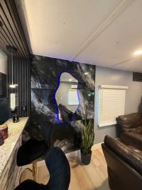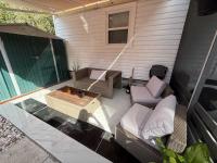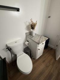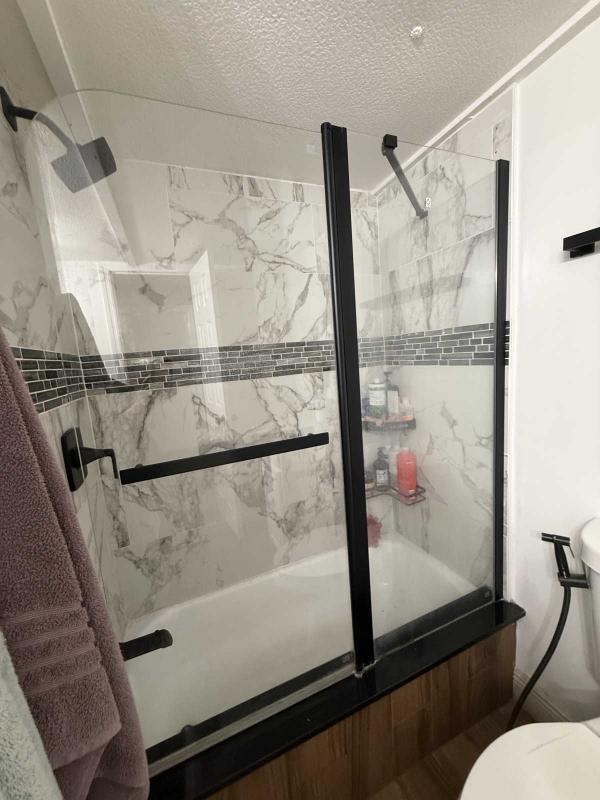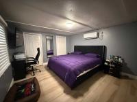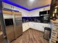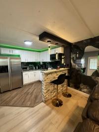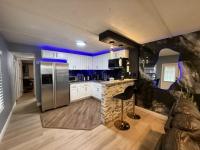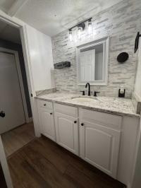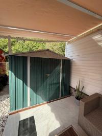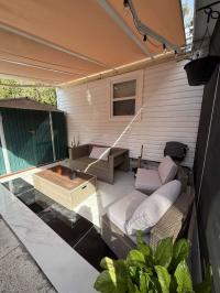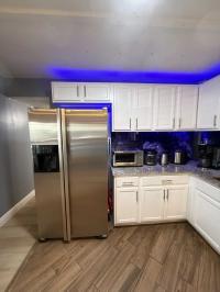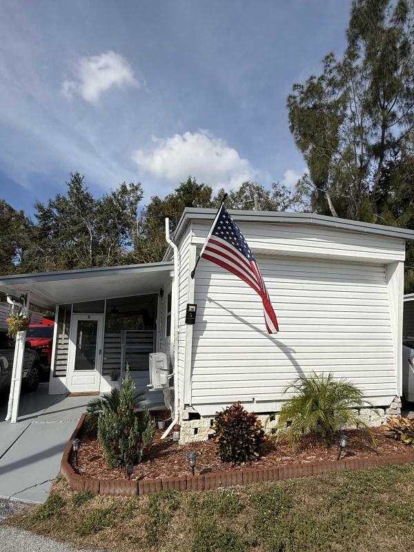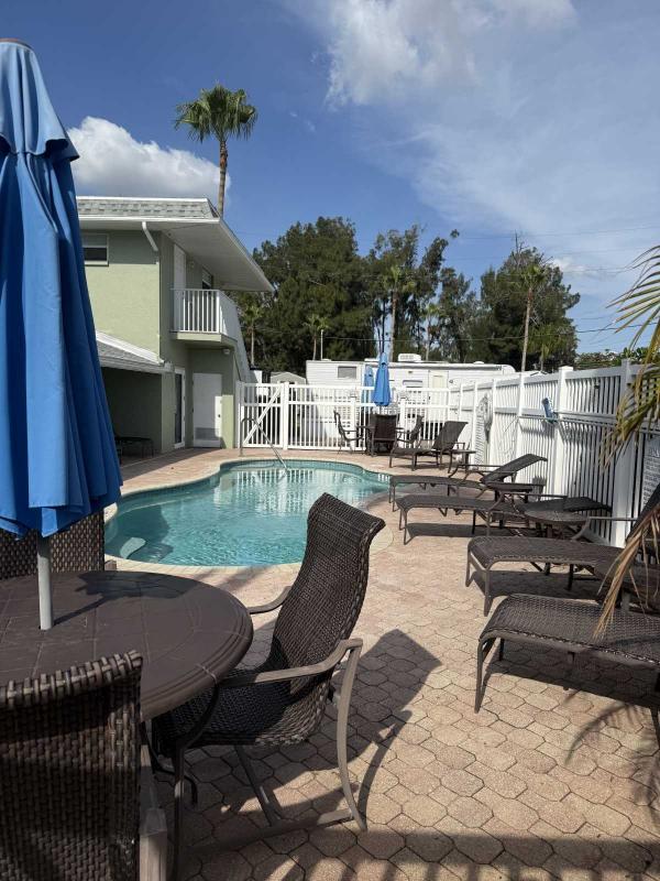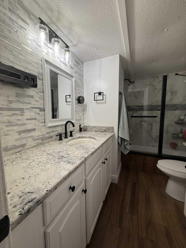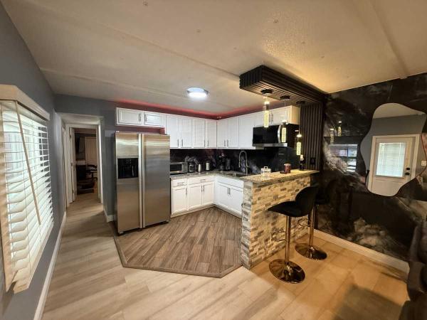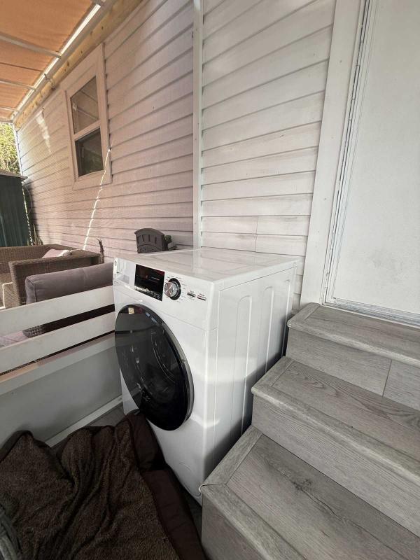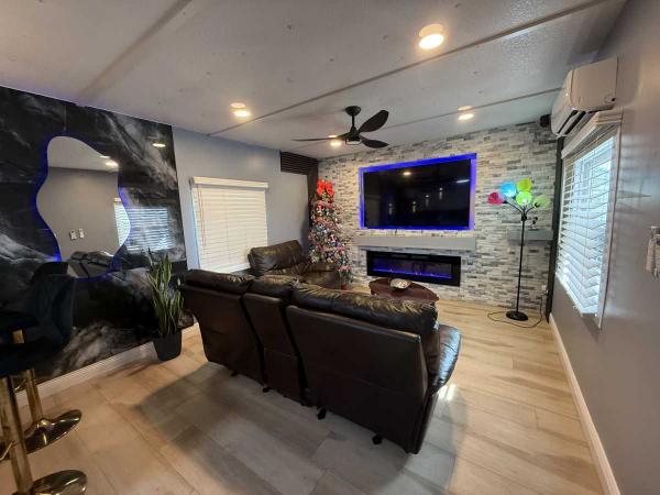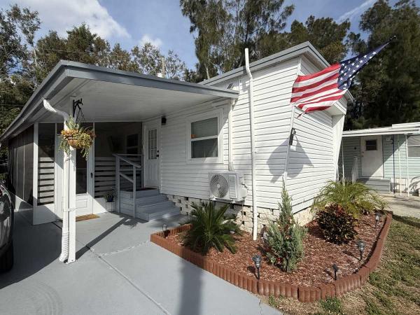 This beautifully updated home has been fully renovated from top to bottom, offering modern style, comfort, and functionality throughout. The renovation includes new sub-flooring and luxury vinyl plank flooring throughout, including the screened-in patio, with new baseboards, new paint inside and outside. The kitchen features new cabinetry, stainless appliances, granite countertops, marble backsplash, tile flooring, glass-top stove, new sink and faucet and color changing lighting. Three modern pendant lights hang above the eat-in area and thoughtful finishes between kitchen and main living area. The family room showcases custom stone accent walls, a built-in fireplace, and a 75" flat-screen TV that conveys. The bathroom has been completely redone with new cabinets, granite counters, new shower, upgraded fixtures, stone wall accents, and modern lighting, creating a spa-like feel. The large bedroom includes three closets, luxury vinyl flooring, and a 55" flat-screen TV included. New baseboards, updated lighting throughout, and designer finishes complete this truly move-in-ready property. Additional living space is found in the upgraded screened-in porch, with wood slatted privacy walls, featuring built-in cabinets, luxury vinyl flooring, a ceiling fan, a 45" TV, and a washer/dryer combo. Outside, enjoy an additional private patio area currently styled with seating for outdoor relaxation, plus a storage shed conveniently located just beyond. Major system upgrades include new windows (2025) throughout for excellent noise reduction, with new blinds with a valance on each window, a ductless mini-split system, new water heater, and an upgraded electrical panel. This is not your typical mobile home, it is a fully renovated, move-in-ready residence with nothing left to do except bring your clothes!