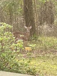 There is a small garage for storage with a carport in front of it and it has a walkway across the side going towards the back with a small deck back there and a fire pit. The woods behind it make it very serene. You will see deer and wild turkey every other day. I have a lot of beautiful photos of them. This is a dead end Street and it is extremely private. No traffic.