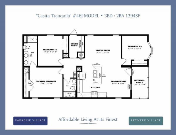 Casita Tranquila is a beautifully finished, brand-new three-bedroom, two-bath home that combines a warm, inviting interior with the rare peace of mind of a full warranty covering both the home itself (by the manufacturer) and its stainless steel appliances. A charming half-porch welcomes you inside, where the home opens into a generous open-concept living, dining, and kitchen area that flows comfortably for everyday living and entertaining. Soft natural-linen colored walls and warm barnwood-style vinyl plank flooring create a calm, cohesive feel throughout the home. A charming round bay window adds architectural character while bringing in additional natural light to one of the three bedrooms. The kitchen features lovely white all-wood shaker cabinetry with tasteful hardware, a full suite of stainless steel appliances including a standard 19.2-cu-ft refrigerator, smooth-top range with built-in microwave above, and ample counter and cabinet space. A center island keeps the cook part of the conversation during meal prep and casual gatherings. The split-bedroom floor plan offers privacy and flexibility, with the primary suite set apart from the guest bedrooms. The primary bath includes dual sinks and a walk-in shower with built-in seating, while the guest bath features a full tub. Clean lines, a neutral palette, and a thoughtful layout make this home easy to enjoy now and simple to personalize over time. Finally, like all homes in this desirable lakeside community, you will appreciate central air and heat, off-street parking (side-by-side in this home's case), your own outdoor storage shed, and access to Paradise Village's extensive recreational amenities including clubhouse, fitness center, tennis and basketball courts, sauna, heated oversized pool complex, lake recreation, and more.