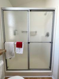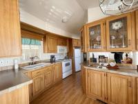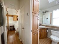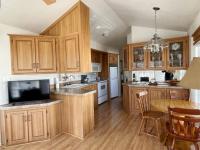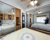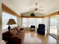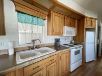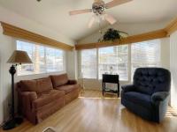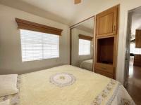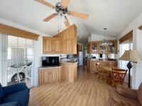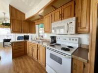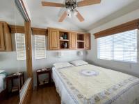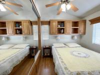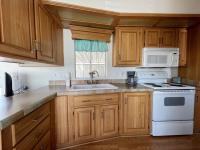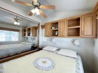 Installed on a concrete slab, this beautiful fully furnished Park Model provides a stable, long-term foundation that prevents settling, reduces pest issues and protects against erosion. It was designed to achieve maximum efficiency and has many special features, all meant to enhance comfort and convenience. The cozy living room offers loveseat, rocker recliner, end table, built-in corner cabinets, new flat screen TV, new 2" blinds, sliding glass door with vertical blinds and a ceiling fan. The adjacent eat-in kitchen boasts high-quality cabinetry, ample counter space, china cabinets, full-size appliances, table and three chairs, some silverware, dishes, pots/pans, and a 3-panel bay window. The bedroom is equipped with a queen size bed, wall-mounted cabinets, two separate closets with mirrored glass doors, built-in dresser, 6-panel pocket door and a ceiling fan. In the bathroom you'll find a large vanity with corner sink, linen cabinet, walk-in shower and a skylight. Additional highlights include: