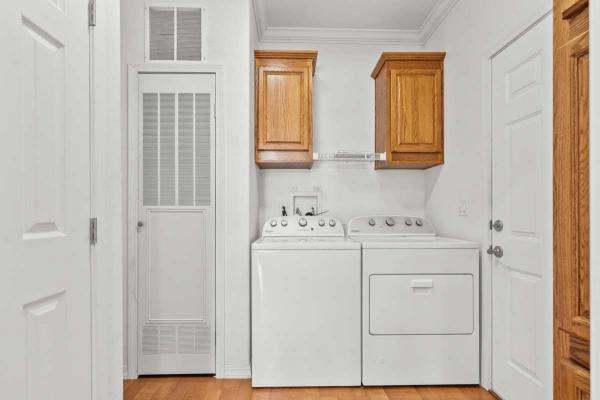 Extra-wide doorways enhance accessibility, while the large laundry room provides extensive cabinetry and direct access to the oversized, finished single-car garage. The garage includes a water heater, garage door opener, and a convenient multi-zone water system.