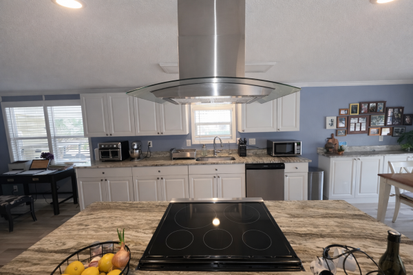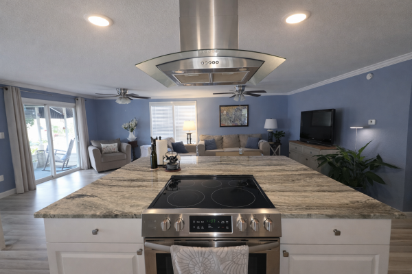 Step inside through the elevated screened enclosure and sliding glass entry into a stunning open-concept interior showcasing finished textured drywall, updated windows with refined white casings, crown molding, oversized baseboards, recessed lighting, dual modern ceiling fans, and uniform gray LVP flooring throughout. The showpiece kitchen stuns with a massive granite-topped island, bright white cabinetry, stainless steel hood, 5-burner glass-top range, dishwasher, microwave, and a dual-door refrigerator with ice and water-designed to impress even the most discerning chef. A dedicated laundry room with brand-new front-load washer and dryer, butcher-block counter, overhead storage, and side-door access adds everyday convenience.