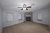 - Spacious living room with wood-burning fireplace