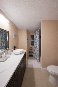 - Modern main bath with wood vanity, vessel sink, contemporary fixtures, and custom tile surround