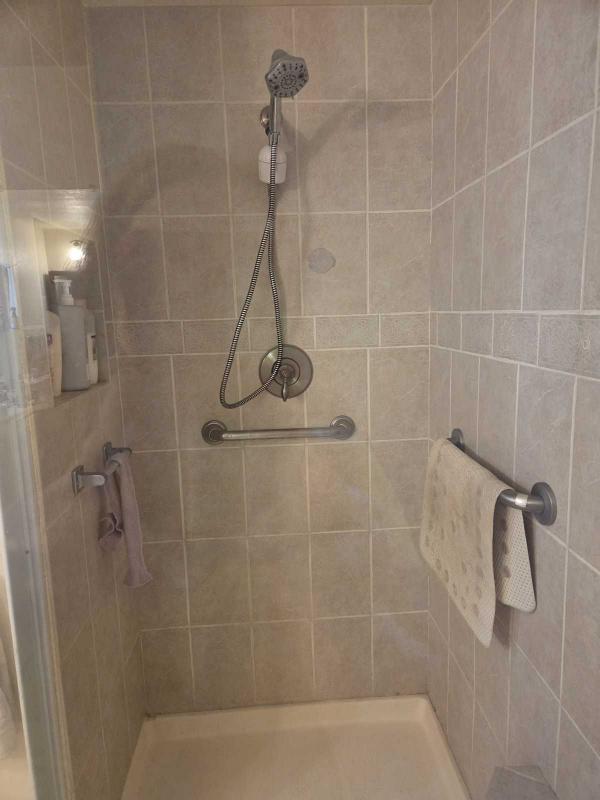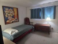 MASTER Bedroom has 2 large closets and master ensuite bathroom with custom Walk-In Shower with seating. ,2 vanities and Storage for towels. Berber carpet in Bedroom Queen size bed with dresser and Chest of Drawers.. Window faces yard and garden.