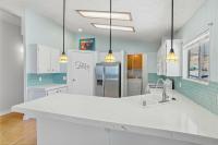 Nicely appointed light and bright Kitchen featuring Upgraded Quartz countertops and subway tile full backsplash, white cabinets and Pantry, freestanding gas 4-burner Range/Oven, built-in Microwave, Stainless Steel Refrigerator/Freezer, Dishwasher, plenty counter space with Breakfast Bar/Peninsula with pendant lighting. Dining Room with ceiling fan/light.